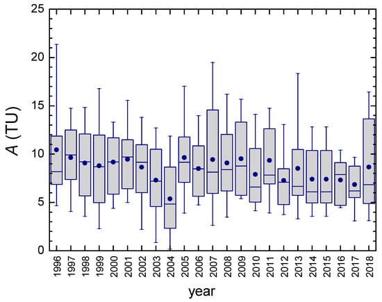 The complete record of tritium activity concentration (A) in precipitation for Zagreb, 1976–2018 (Figure 5), exhibited a pattern typical of continental stations of the Northern Hemisphere. Seasonal variations were superposed on the basic decreasing trend of mean annual values until approximately 1996. The maximal monthly 3H activity concentration at the Zagreb station was observed between May and July, mostly in June. A secondary maximum was also observed three times in January and February. The lowest 3H activity concentrations were almost uniformly distributed from October to February, with a slightly more frequent occurrence in December.