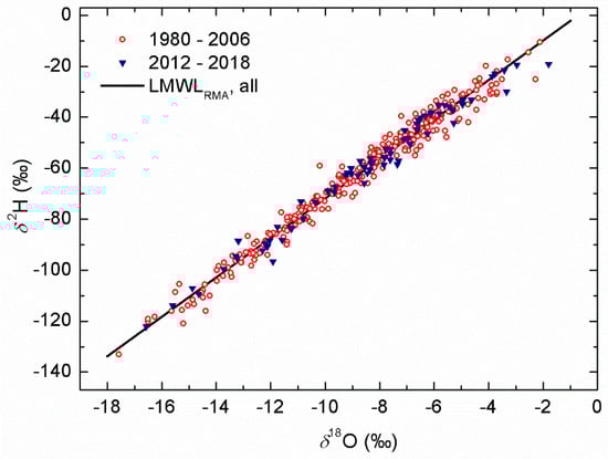 The relation in Equation (2) is referred to as the global meteoric water line (GMWL) [2,39,42]. It describes the general relation between δ2H and δ18O on a global scale reasonably well. However, the intercept is higher for precipitation originating from the Mediterranean area [2,4,43,44,45], while the slope does not change, as in the case of the eastern Mediterranean meteoric water line, δ2H = 8 δ18O + 22 [43]. This example shows that for applications in hydrogeological studies, regional local meteoric water lines (LMWLs), either long-term or for certain shorter periods, can be more appropriate. Generally, an LMWL has the form δ2H = a δ18O + b, where a is the slope and b is the intercept. LMWLs can differ from the GMWL in terms of both the slope and intercept values, depending on the conditions for forming a local water source [1,4,46,47]. There are different ways of calculating a- and b-values. Traditionally, the ordinary least squares regression (OLSR) is used, and more recently, the reduced major axis regression (RMA) and the major axis least squares regression (MA, sometimes also called the orthogonal regression) [48,49] have been applied. The precipitation-weighted OLSR approach (PWLSR) was introduced to reduce the impact of small precipitation events that are hydrogeologically not significant [49]. Similarly, precipitation-weighted RMA and MA, i.e., PWRMA and PWMA, regressions have been applied to data from the GNIP database, with at least 36 monthly datapoints available [48].