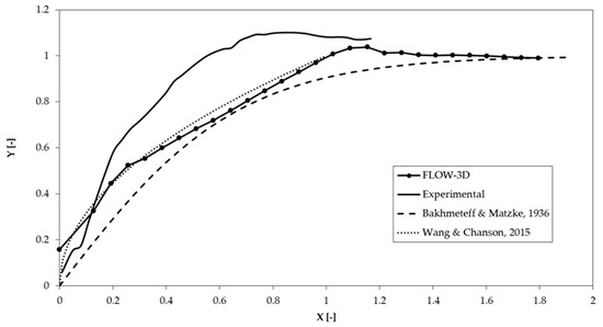 Dimensionless free surface profile of the hydraulic jump performed by the numerical and physical models, and contrast with data by Bakhmeteff and Matzke [56] and Wang and Chanson [8].
