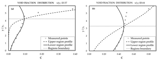 Measured void fraction in a vertical profile with the adjusted expressions for the upper and the lower regions: (a) Physical model (x/y1 = 20.57), (b) numerical model (x/y1 = 20.64).