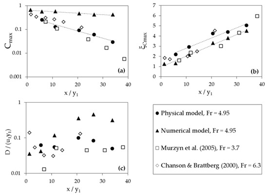 Figure 7b shows results concerning the normalized height at which this maximum void fraction is reached (). Clearly increases as the distance to the hydraulic jump toe increases. The estimated gradient was 0.101 (physical model) and 0.107 (numerical model). These results are almost coincident to those obtained by Murzyn et al. [18] and Chanson and Brattberg [17], reporting values of 0.102 and 0.108, respectively.