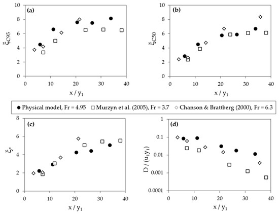 With regards to the diffusion coefficient values (Figure 8d), a decreasing trend with x could be identified in the upper region, unlike previously estimated values for the lower region. This is in good agreement with the observations made by Murzyn et al. [18] and Chanson and Brattberg [17].