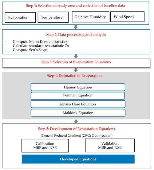 The framework for the methodology is given in Figure 1. The most difficult task in this research was to collect the extensive data required for the calibration, development, and validation of evaporation equations on the basis of pan evaporation. These data were collected from the Municipality of Buraydah, Qassim, Saudi Arabia, as mentioned above. A brief summary of evaporation and other meteorological data measurement is described below.