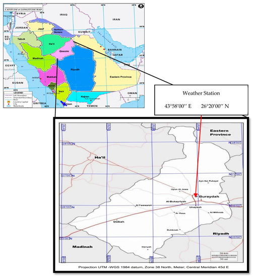 The weather station was situated near the Buraydah City Center (Figure 2), which was used to measure the evaporation from pan along with other meteorological data. The first data scrutiny was conducted by visual inspection of the data, checking value by value. Abnormal values, like zero evaporation against a temperature range of 30 to 40 °C, were removed. Relative humidity values greater than 100% were also removed. The cells corresponding to these removed values were kept blank for estimating the average values of various meteorological data elements, including evaporation and relative humidity. The same station had rain gauges to measure rainfall. Rainfall in the Qassim Region mostly occurs in winter. The one-day, two-day, and three-day maximum rainfall values for Qassim were 86, 92, and 95 mm, respectively. The rainfall in the study area was mainly due to the advection phenomenon. Advection is a common mechanism for heat transfer from a hot earth surface to air masses in arid regions. It also had a great impact on the evaporation process, which should be considered when developing equations for arid regions.