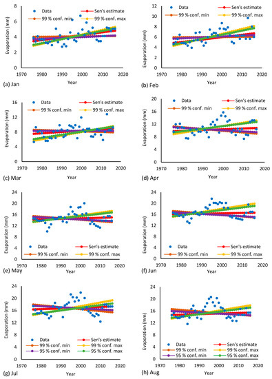 The trend analysis results are given in Table 3 and Figure 4. It was noticed that there was a positive trend in evaporation for the months of January, February, November, and December. There was no trend in the months of high evaporation during summer, so the data could be used for estimations of evaporation. The trends of only a few months would not affect the results of the evaporation equations. It is worth mentioning here that the equations would have limitations for producing high accuracy results during the months of January, February, November, and December, because the whole data from all months over the calibration and validation periods were used without removing the trend component of the data. However, the results related to the months of high evaporation could be considered to be reasonably accurate, as there was no trend in evaporation for these months.
