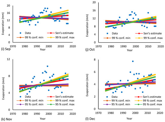 Trends of evaporation data in the month of: (a) January; (b) February; (c) March; (d) April; (e) May; (f) June; (g) July; (h) August; (i) September; (j) October; (k) November; and (l) December.