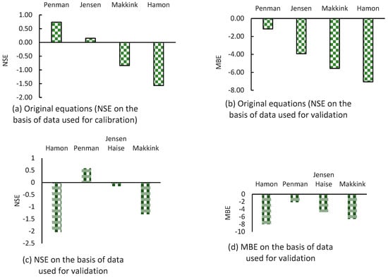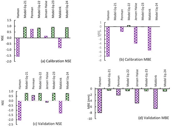 NSE and MBE values for simulated evaporation from the various developed equations: (a) Calibration NSE; (b) Calibration MBE; (c) Validation NSE; and (d) Validation MBE.