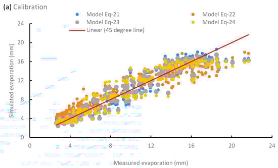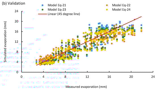 Comparison of the observed and simulated values of evaporation obtained from the four developed equations: (a) Calibration; and (b) Validation.