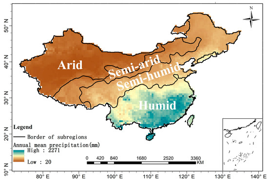 Four climate categorizations and annual mean precipitation (mm) in China produced using gridded data with 0.5° spatial resolution based on more than 2400 national meteorology stations.