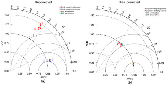 Taylor diagrams of uncorrected (a) and bias-corrected (b) precipitation and temperature of 9 CMIP5 models and 9ME.
