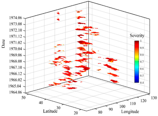 Table 2 also summarizes the top four prominent drought events based on the comprehensive index and durations. Figure 4 shows the three-dimensional spatial distribution of drought area and severity of most prominent events for every ten months of the data record. During its early stages, the drought event of 1964–1974 was mainly distributed across northwest China (western and southeastern Xinjiang, Gansu, and Inner Mongolia) before becoming widespread throughout the whole of China. Towards the end of this drought event, the affected area and severity had decreased significantly.