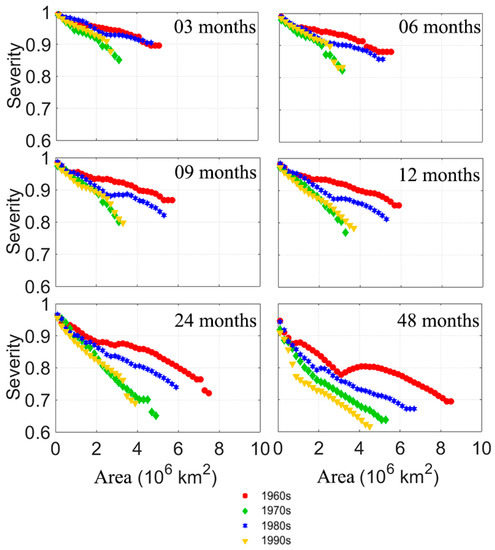 It was noted that the drought events in the 1960s dominated the SAD envelope curves for areas up to 5 × 106 km2. This was also observed by Wang et al. [41], who analyzed soil moisture drought in China based on using the SAD method. For drought areas of less than 1 × 106 km2, the most serious events lasting 3 to 12 months occurred in the 1980s. The SAD envelope curves of the 1970s and 1990s events showed relatively small areal extents and lower severity, but the slopes of these envelope curves were significantly steeper than for the other decades.