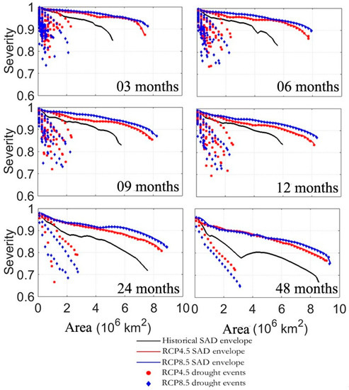 Figure 6 shows the SAD envelope curves and drought events for the historical period and for the future period based on the two RCPs. The envelope curves under the two RCPs were above the historical envelope curves for all durations, and their spatial extents were also larger than those of the historical period. However, the slopes for the two RCPs were smaller than for the historical period. This indicates that future droughts (under both RCP scenarios) would be more severe than those that occurred during the historical period.