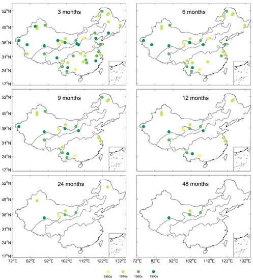 The drought centers of all historical drought events (1961–2000) with different durations are shown in Figure 7. We found that during the early decades of the study period, drought centers were mainly distributed in the northwestern and northern regions of China. This was in line with Zhai et al. [42], who analyzed the spatial distribution of drought centers for different durations (1, 3, 6, 9, 12, 24 months) in China for the period 1960–2013. Meanwhile, most drought centers for the late 20th century were located in the semi-arid and southeast parts of the humid regions.