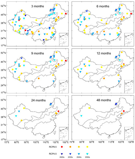 The distributions of drought centers under RCP 4.5 and RCP 8.5 scenarios are shown in Figure 8. The modeled drought centers with short durations (less than 6 months) were distributed throughout China, similar to the observed droughts during the historical period. However, the 9- and 12- month drought centers modeled under two RCPs showed different spatial patterns. Under RCP4.5, drought centers mainly occurred in the northwest of the arid region and in the northeast of the semi-humid region and were more concentrated than under RCP8.5. By comparison, the historical drought centers with the same durations were mostly located at the boundary of the arid and semi-arid regions, and in the southwest of the humid region. This indicates that the frequency of drought events would increase over northeastern China in the future. In this respect, we achieved the same result as Zhai et al. [50] who analyzed the drought trends using the PDSI and the SPI. Drought centers with 24- and 48-month durations were predicted to occur mostly during the 2030s and the 2040s, and the distribution of these drought centers under the two RCPs was roughly similar to the moderate duration events (9- and 12- month), although this was clearly different from the historical period.