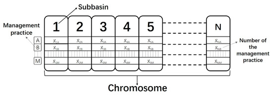 NSGAII generates offspring using a specific type of crossover and mutation and selects the next generation according to non-dominated sorting and crowding distance comparison. Figure 2 illustrates the genetic encoding of the various measure’s structures for arrangement of conservation practices in the optimization algorithm. The sub-basins delineated by RGWLF and the configurations of management practices in each sub-basin form the basic chromosome units. The length of each chromosome is equal to the total number of sub-basins.