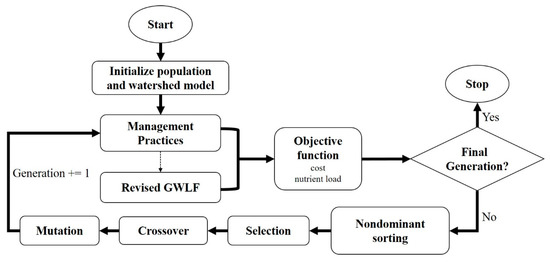 The non-dominated sorting genetic algorithms II (NSGAII) is the most popular method for multi-objective optimization, whose ultimate goal is to find “Pareto-optimal” solutions, which is a modified version based on the genetic algorithm [15]. For example: Maringanti et al. utilized the Soil and Water Assessment Tool (SWAT) model and NGSAII to analyze the funding input under different combinations of fertilization reduction ratios, riparian filter belt widths, and other agricultural management measures in a tributary of the Mississippi River [16,17]; Ahmadi et al. combined the SWAT model and the NSGAII algorithm to evaluate the prevention and treatment effects of Atrazine through various evaluation indicators and non-point source management measures in the Eagle Creek Watershed in Indiana, USA [18]; and Geng et al. coupled the SWAT model and NSGAII algorithm to calculate the relationship between the amount of nutrient reduction and the required funding in the Chaohe River Watershed upstream of the Miyun Reservoir in China [19]. However, almost all studies in this category have focused on non-point source pollution BMPs and ignored point source BMP measures. It can be inferred, therefore, that the description of point source measures is not easy in the management practices of the watershed model.