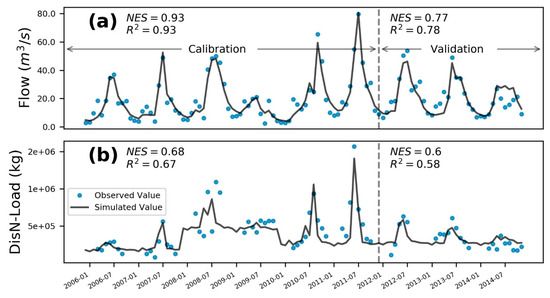 Time-series for the entire period (2006–2014) of observed and simulated monthly streamflow (a) and dissolved nitrogen (b).