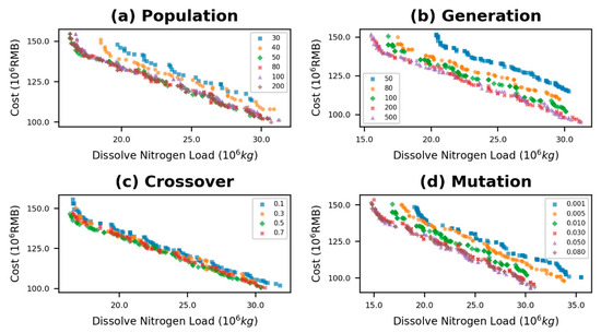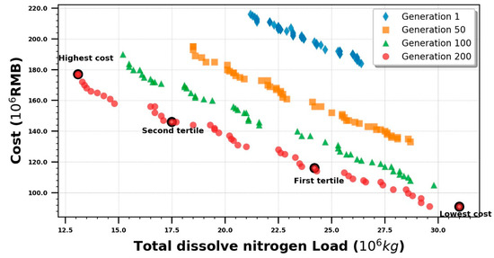 Figure 6 provides the final optimization progress with two objectives, minimizing the net cost and dissolved nitrogen load by scattering four Pareto-optimal fronts belonging to four generations (1, 50, 100 and 200). The overall trend for the four scatter diagrams was that the dissolved nitrogen decreased as the net cost increased. Each new generation’s chromosomes were initialized by random numbers without no optimization process (such as non-dominance, selection, crossover, and so on), so it was regarded as the 0th generation and not shown in the figure. In the first generation, the distribution of points was more concentrated, indicating that the solutions were less differentiated. As the number of generations increased, the solution became more and more scalable, and came closer to the origin. For the final generation, the most widespread solution set, which was closest to the origin, can be seen. Thus, the best quality and broadest decision supports were supplied to the policy researchers and decision-makers.