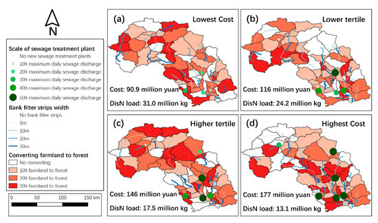 The set of solutions was divided into three segments with four endpoints, which were: the lowest cost, the lower tertile cost point, the higher tertile cost point, and the highest cost. The values of cost, dissolved nitrogen load, and spatial distribution of corresponding management measures for the four scenarios are shown in Figure 7. For the lowest cost scenario (Figure 7a), the scale of treatment of polluted water plants is small and the measures are mainly bank filter strips and converting farmland to forest. As cost increased, the intensity and scale of management practices also increased, which is illustrated in Figure 7b,c. At the point of maximum cost (Figure 7d), the load of dissolved nitrogen reached its minimum value, where the designed daily treatment capacity of the sewage plant was extremely high and there was no conversion of farmland to forests in some upstream sub-basins. The majority of management practices are concentrated in middle and lower regions of the watershed.