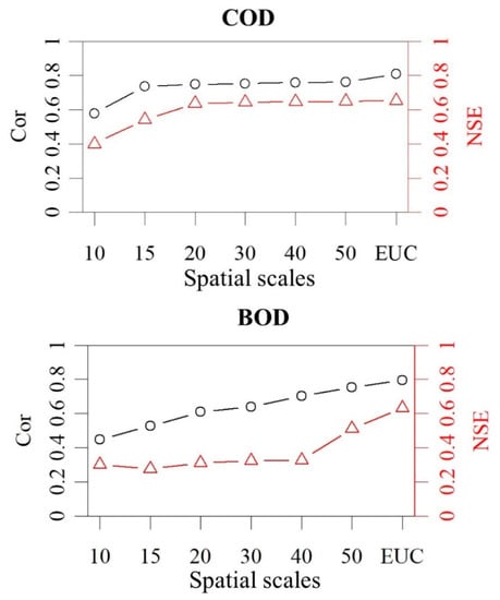 Table 6), which were about 30 times higher in the EUC scale than those in the 10 km radii scale. It is the main reason why human activities in the catchment scale could give the best explanation to variations of COD and BOD in the HRB. The results suggested that efficient strategies for better water environment protection should consider different spatial scales based on different characteristics of contaminants matters. Accordingly, for unstable water quality indicators, more attention should be paid in local scales around monitor stations, while for stable contaminants, management on the whole catchments should be implemented.