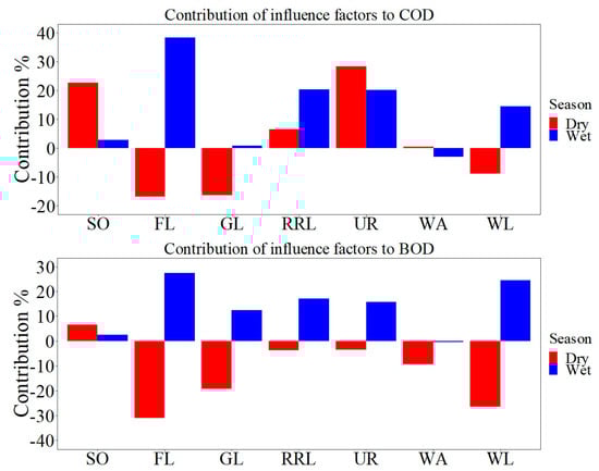 Urban had a significant positive contribution to COD in both seasons, which was related to the high percentage of impervious surface coverage in the area. Without the infiltration process happening on the soil surface, the overland runoff on the impervious ground could be generated under even slight rainfalls in dry seasons. Therefore, the contributions of urban areas were insensitive to the variations of the surface runoff between dry and wet seasons when comparing to farmland’s soil surface, which experienced the transition between the “sink” and “source” processes. Although urban areas had a slightly weak negative contribution to BOD in dry seasons, it became a fundamental source of BOD contaminants in wet seasons. In general, the urban areas made significant contributions to increasing the organic pollution in the HRB. The results were consistent with previous studies, which highlighted that intensive anthropogenic activities, such as food waste, stocked garbage and domestic wastewater, played an important role in water quality degradations [