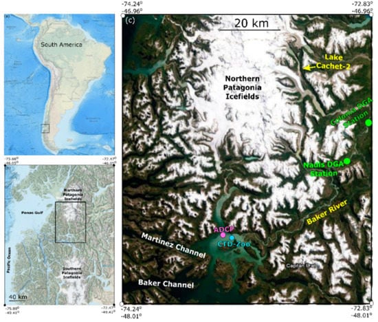 Located in the Southern Hemisphere, Patagonian Chile represents 240,000 km2 of glacially carved land on the southwest coast of Chile [11]. It features a mountainous coastline and complex fjord and channel systems that were glacially carved through the steep slopes of the Andes mountain range. The Northern and Southern Patagonia Ice Fields supply freshwater to the fjords through glacially fed rivers and lakes and represent the largest two bodies of ice in the southern hemisphere.