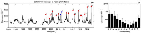(a) Time series of Baker river discharge at the DGA Ñadis station from 2003–2014. The red dots denote the GLOF events reported by the DGA and blue dots represent other possible GLOF events. (b) Long-term monthly mean river discharge with the standard deviations.