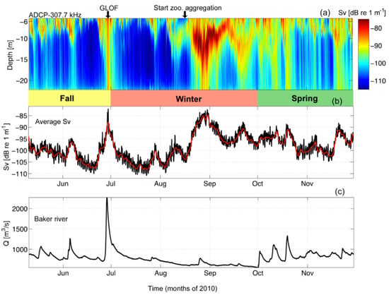 (a) Volume backscattering strength (Sv, in dB re 1 m−1) from autumn to spring of 2010. (b) The depth average of Sv in black with the 30 h low-passed time series depicted by the center line. (c) Hourly Baker River discharge measurements (m3 s−1).