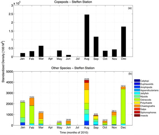 In-situ zooplankton samples were collected monthly adjacent to the ADCP mooring in 2010 (Figure 1c). This was accomplished with a Bongo net towed from 25 m depth to the surface (60 cm mouth opening, 300 µm mesh, flowmeter mounted in the net frame) [27]. All samples were preserved in a 5% formaldehyde solution [36,37]. At the laboratory, the zooplankton samples were identified and separated into major functional groups and organisms ≥5 mm in size (detectable size for 307.7 kHz ADCP) were classified to the lowest taxonomical level. Zooplankton abundances were standardized to individuals per 100 m3 of filtered seawater [38].