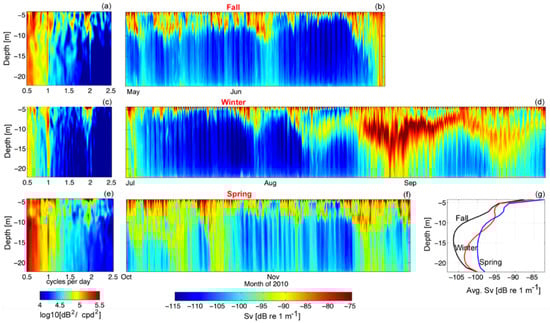 (a) Spectra of the autumn time series of Sv (log10 (dB2/cpd2)), (b) is the autumn Sv time series. (c,d) are the same as (a,b) for the winter time series. (e,f) are the same as (a,b) for the spring time series. (g) Time averages of Sv for each season.