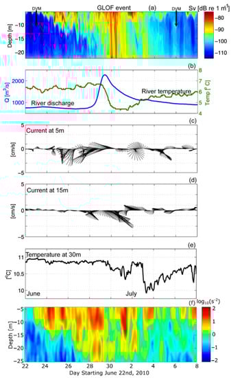 GLOF events occur in Martinez Channel when the Baker River discharge exceeds 2000 m3 s−1 [13]. On 29 June 2010 the Baker River discharge reached 2200 m3 s−1 and the acoustic profiler captured the fjord’s response. A diel signal in Sv was found prior to (22–25 June) and after (4–7 July) the GLOF II (Table 1) event, that was related to diel vertical migrations (DVM) of zooplankton (Figure 6a). Starting on 24 June, Sv increased around the pycnocline (10–12 m) and subsequently became enhanced in both intensity and vertical extent until 4 July. The gradual increase in Sv was suspected to be sediment transported by the start of the floodwaters through the Baker River (Figure 6b). There was a slight increase in river discharge on 23 June and a ~0.5° drop in temperature in the river, which indicated that the ice dam could have weakened on the 23rd. Weakening of the ice dam let some of the floodwaters escape. Full release (or breaking) of the ice dam occurred on 28 June (Figure 6a,b). By 28 June, river flow increased from 780 to ~2200 m−3 s−1 and the Sv signal became elevated (>-90 dB) from near surface to ~25 m (the extent of the ADCP measurements). The Baker River discharge reached its peak at 09:00 on 29 June and at this time the river water temperature decreased from 6.6 °C to 4.3 °C (Figure 6b). Approximately 13 h after the river discharge peak at Colonia Station, the ADCP recorded increased backscatter associated with riverine suspended material. The flood waters arrived in the fjord at approximately 22:00 on 29 June. A second pulse of enhanced Sv was recorded 8 h later at 06:00 on 30 June with similar features as the first (Figure 6a); however, the river discharge measurements did not spike a second time. This could be due to a second release of riverine water down-stream of the Colonia station; however, this is speculation because discharge measurements were not available farther downstream at this time. On 1 July 2010 the elevated Sv signal from the GLOF II event slowly tapered off but remained apparent throughout the water column until 5 July (4 days later), when the diel vertical migrations of zooplankton were once again recognizable within the water column (Figure 6a).