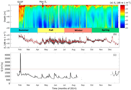 (a) Volume backscatter, Sv from January to December of 2014, (b) the depth average of Sv (black line) and the low-pass filtered (30 h), depth-averaged Sv (red line), (c) river discharge (black line) with a discharge value of 2000 m3 s−1, indicative of a GLOF, depicted by the red line.