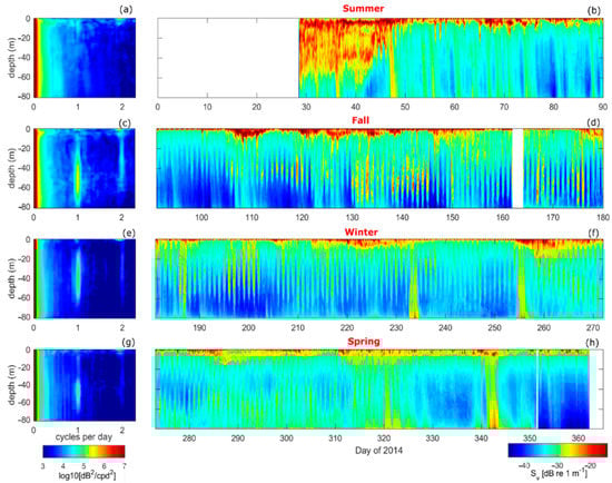 (a) Spectra of Sv from the austral summer (January–March) at each depth (y-axis), (b) time series of Sv from the austral summer. (c,d) are the same as (a,b) but for the austral fall (April–June), (e,f) are the same as (a,b) but for the austral winter (July–September), (g,h) are the same as (a,b) but for austral spring (October–December).