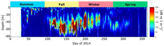 The highest Sv signal was found in late winter and into the spring seasons of 2010 (Figure 5) and in the spring, summer, and fall of 2014 (Figure 8). However, the 2010 dataset did not include measurements from the summer. From mid-August to the end of September of 2010, an increase in the Sv signal near the surface was indicative of a deepening of the pycnocline layer (Figure 5d). The low frequency modulation was the result of wind setup, which created a downward slope of the pycnocline from the fjord mouth toward the head of Martinez Channel, which relaxed upon cessation of the wind [31]. This was found to be a result of the Baroclinic Annular Mode (BAM), which produces periods of enhanced storminess in the extratropical southern hemisphere every 20–30 days [31]. During 2014, this pattern was also found in the volume backscatter and the along-channel current velocities (Figure 11). In fact, throughout the year of 2014 every 19–30 days, near-surface along-channel flows were directed into the estuary, concurrently with up-estuary winds (Figure 11a,b). Further, at almost each instance of up-estuary along-channel flows and wind, the Sv was also elevated. This indicates that the BAM influences the physics of Martinez Channel both intra- and inter-annually, which was unresolved in [31].