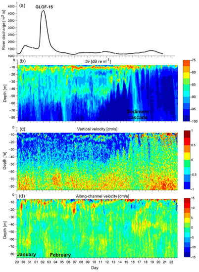 GLOF 15 occurred on 1 February 2014 while the ADCP was moored at ~80 m depth, making it possible to capture the depth influence of the GLOF 15 waters and sediments, which was not captured for GLOF II (Figure 6 and Figure 10). The maximum river discharge from GLOF 15 was 4239 m3 s−1. The discharge pulse over 2000 m3 s−1 (indicative of a GLOF) lasted for 37 h from 1–3 February 2014 (Figure 10a). The Sv data show the highest values at ~10 m depth, indicating that most of the sediment and other particulate organic matter from the GLOF-15 is retained in the pycnocline zone (Figure 10a,b). However, increased Sv related to the GLOF did extend to ~60 m depth. As with GLOF II, Sv became elevated before the maximum flood waters were recorded (29 January–1 February). As was surmised for GLOF II, this response could be due to some flood waters becoming released before the ice dam fully broke. More data are needed in order to verify this hypothesis. The vertical velocity (w) from the ADCP evidenced a consistent settling of the terrestrial-derived sediment (~−1 cm s−1), introduced to the fjord from GLOF 15, from the surface to ~50 m depth from 29 January to 12 February (Figure 10c).