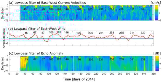 (a) Low-pass filtered (5 day) east-west (along-channel) velocities where the numbers indicate a day of 2014 when the low-passed currents were sustained above 5 cm s−1 for over a 5 day period. (b) Low-pass filtered east-west wind with the same days marked as in (a), and (c) low-pass filtered echo anomaly.