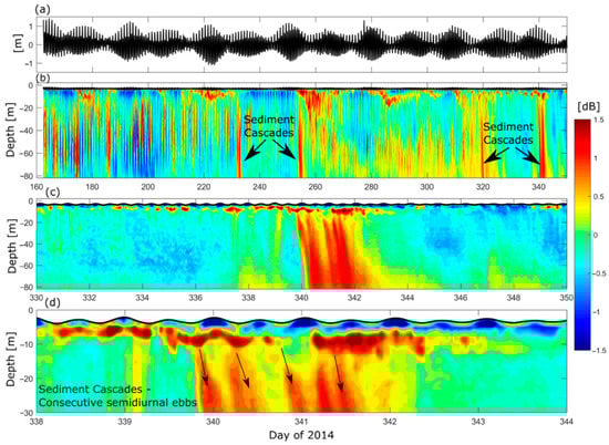 To investigate the occurrence of the sediment cascades and how they correlate to the tide, the echo anomaly and water levels were compared from day 160 to 350 of 2014, when water level measurements were available from the pressure sensor of the ADCP (Figure 12). Sediment cascades are shown on days 232, 255, 320, and 341 (Figure 12b). Focusing on the sediment cascade on day 341, it is apparent that this occurs after a BAM event (Figure 11) when there is elevated near-surface eastward (up-fjord) currents. This implies that the cascades develop after up-fjord winds decrease the discharge from the river by retaining flood waters and the sediments therein. After the wind relaxes, the river sediments are released to the fjord, causing a cascade in consecutive semidiurnal ebbs (Figure 12c,d). The sediments from consecutive ebbs eventually merge at depths between ~20–35 m and accumulate at greater depths. As this is toward the head of the fjord, this could be one of the potential causes of channelized sediment waves found in this fjord [53].