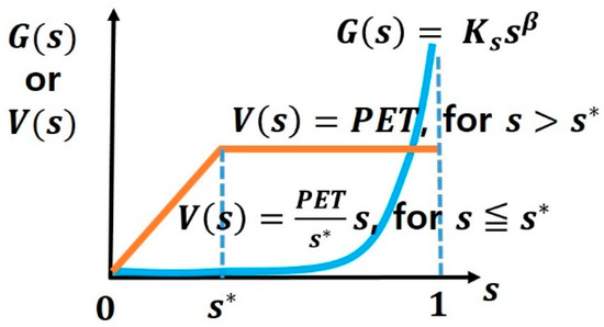 Assuming that soil water is given at time , the terms necessary for the calculation of in Equation (11) are derived as follows: