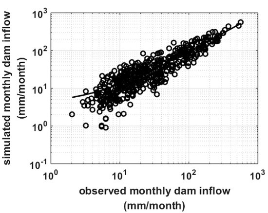 where is the number of observational monthly data ( = 456 in this study) applied to the parameter estimation, and and are the monthly dam inflow calculated by the proposed model and observed monthly dam inflow, respectively. The proposed hydrologic partitioning dynamics have a threshold behavior as shown in Equation (3). In other words, a discontinuous governing equation is used to mathematically explain the wetting process. This discontinuity, however, adds unnecessary non-smoothness to the objective function for parameter estimation. Several studies recommend applying smoothing to threshold based model Equations (i.e., [51]). However, the model proposed in this study consists of relatively simple governing equations, and its purpose is to implement average hydrologic partitioning behavior on a yearly basis (or monthly and seasonal basis) using probabilistic techniques. The smoothing of the discontinuity was considered to be beyond the scope of this study. Thus, no model smoothing strategies were applied in this study. During parameter estimation procedure, the range of parameters was set as follows: = [0, 1]: all physically possible ranges, = [0, 1]: all physically possible ranges, = [30, 270]: the range of NRCS hydrological soil groups Type A, B, and C (mm/day), = [1, 10]: subjectively determined by authors as realistically possible range. We thought that the estimated parameters were all considered to be in the appropriate range. Looking at the estimated parameter values, = 0.26134, = 0.48844, = 87.5183 mm/day, and = 4.7581, respectively. Using these parameters, the observed monthly dam inflow data from 1981 to 2018 were compared to the simulated data (see Figure 3). As can be seen from the figure, the modeled monthly dam inflows properly re-generated the observed inflows with of 0.8868 and (Nash–Sutcliffe model efficiency coefficient [52]) of 0.8861.