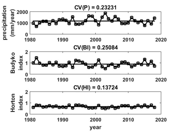 Inter-annual variability of precipitation, the Budyko index, and the Horton index.