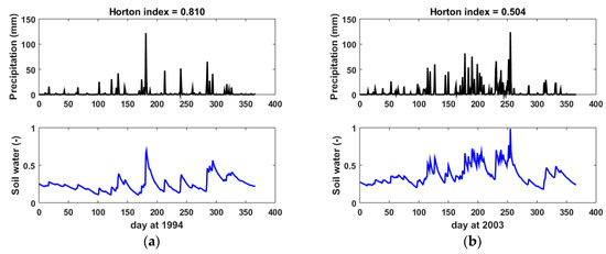 Figure 6a shows the daily precipitation observed in 1994 and the daily soil water simulated in 1994 showing the highest Horton index (0.810) during the simulated period. Figure 6b shows the lowest Horton index (0.504) in the year 2003. The year 1994 was the year of the most extreme drought in Korea (annual precipitation 878 mm). Even in the EAMC area, vegetation is in a state of stress on water in the same climate conditions as in 1994, and water use efficiency (i.e., Horton index) similar to that in the semi-arid region is shown [54]. For reference, the year 2003 was the year in which the most serious typhoon damage occurred in Korea, and the annual precipitation was the largest (annual precipitation 1864 mm). It can be seen that the soil water was almost saturated at the time of typhoon occurrence, and the lowest Horton index was recorded in the simulated period (1981–2018). On the other hand, the bar in Figure 7 represents the relative frequency of simulated daily soil water for 38 years, and the solid line with circles is PDF derived from Equation (26). It can be seen that the PDF derived using five meteorological variable statistics relatively well reproduced the statistical characteristics of numerically simulated soil water. For the numerically simulated soil water, the mean was 0.283 and the standard deviation was 0.124. For soil water derived from the proposed PDF, the mean was 0.281 and the standard deviation was 0.114. This agreement means that the stochastic model applied in this study reproduced the numerically simulated soil water behavior. Therefore, it would be possible to examine the behavior of the Horton index using the PDF of soil water obtained using the proposed stochastic model. As mentioned previously, since it is possible to directly simulate daily soil water using the deterministic model, it is also possible to obtain a soil water PDF using numerically simulated soil water time series. However, running the deterministic model requires daily climate date. In other words, if there is observed (or simulated) daily climate data, a soil water PDF can be obtained and thus Horton index can be calculated without the stochastic model. However, considering the variability of climate data (e.g., 10% increase or decrease in mean or 10% increase or decrease in variance), soil water PDFs using the proposed stochastic model can be useful for calculating the Horton index. The proposed stochastic model does not require the input of daily climate data. Since only representative statistics of the climate date are needed to drive the proposed stochastic model, the methodology of calculating Horton index from the soil water PDF using the proposed stochastic model can be useful for examining the effects of future climate change scenarios.