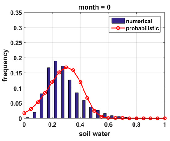 Comparison of numerically simulated histogram and modeled probability distribution function (PDF) of soil water.