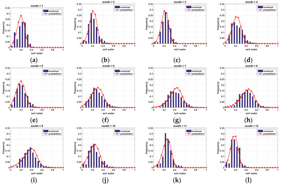 Seasonal comparison of numerically simulated histogram and modeled PDF of soil water. (a) January, (b) February, (c) March, (d) April, (e) May, (f) June, (g) July, (h) August, (i) September, (j) October, (k) November, and (l) December.