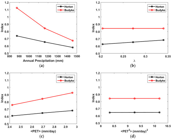 Sensitivity of the Horton index to meteorological statistics. (a) Annual precipitation, (b) , (c) , and (d) .