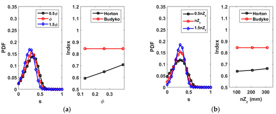 Sensitivity of soil water PDF and the Horton index to land surface characteristics. (a) Surface runoff coefficient and (b) effective soil depth.