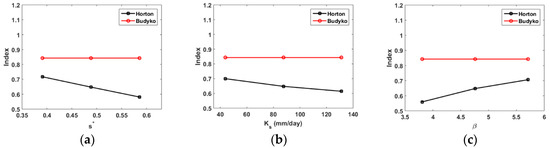 Figure 11 shows the sensitivity of the Horton index to vegetation and soil properties such as , , and . The smaller the and , and the larger the , the higher the Horton index. This sensitivity can be explained using Equation (1), which is the governing equation of soil water dynamics. That is, as the loss of soil water due to vaporization increases and the loss of soil water due to groundwater recharge decreases, the Horton index moves in an increasing direction. Given that the Horton index is an eco-hydrological proxy representing the water use efficiency of vegetation, the activation of vegetation by vaporization will cause the Horton index to increase. In addition, the reduction of groundwater recharge will increase the Horton index because vegetation makes the environment more favorable for using soil water [55]. In terms of the magnitude of the sensitivity, it can be seen that the sensitivity of the Horton index to and is much greater than . In addition, the proposed model does not take into account the interaction between vegetation and soil properties and local meteorology, indicating that the sensitivity of the Budyko index to vegetation and soil properties was not significant.