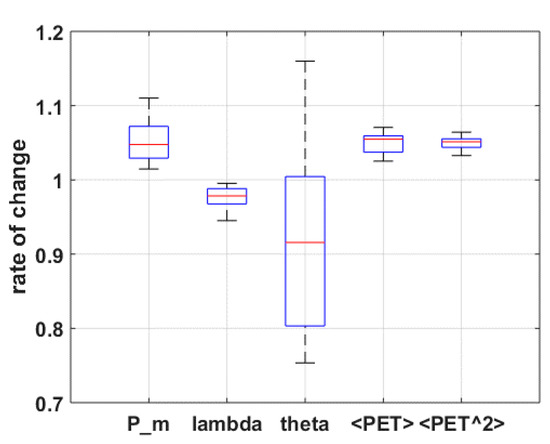 In fact, using observed climate data or projected climate data under future climatic conditions, the corresponding soil water PDF can be obtained by running the deterministic model (i.e., Equation (1)) directly, and then Horton index can be calculated using the numerically obtained soil water PDF and Equation (10). Since the deterministic model also simulates wetting and vaporization directly, we could calculate Horton index directly from wetting and vaporization simulation data without calculating soil water PDF. However, in this study, the reliability of the future daily precipitation data itself was not relatively high, but the basic statistics such as the mean and the variance of the data were judged to be the reliable future prospects. Therefore, we tried to examine the change of future Horton index by constructing stochastic model that could obtain soil water PDF using basic statistics of climate data.