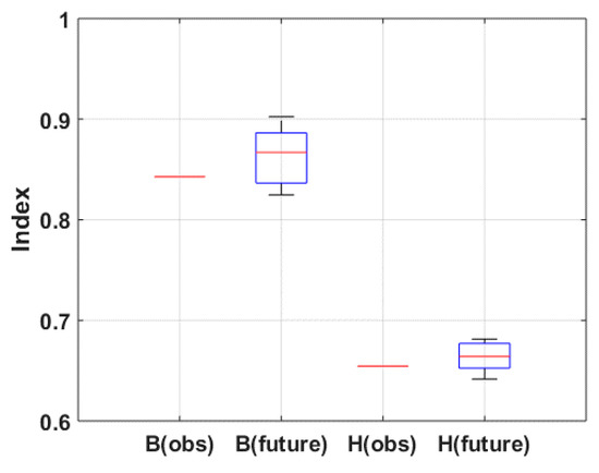 Figure 14 shows the degree of change in the future Budyko and Horton indexes. The present Budyko index was 0.843, and the rage of change in the future Budyko index was projected to range from −2.13% to +7.78%. The ensemble average Budyko index using 16 future climate ensembles was 0.862, with a potential increase of 2.27%. In other words, the future climate of the study area was likely to be slightly drier than the present climate. On the other hand, the present Horton index was 0.655, and the rate of change in the future Horton index was projected to change in the range of −1.96% to +4.09%. The average of the future ensemble of Horton index, simulated using 16 future climate ensembles, was 0.663, which means that it was likely to have a slightly larger value than the present. Future precipitation in the applied area increased, but Horton index was likely to increase further. Increasing Horton index means that vegetation was required to use water in the soil more efficiently than it was now. Thus, an increase in Horton index could be interpreted to indicate that the stress the vegetation was subjected to by water was likely to increase slightly more than now. This result revealed that it was a wrong approach to interpret future increases in precipitation as a reduction in vegetation water stress in the watershed from the relationship in Figure 5. Due to the variation in precipitation patterns and the increase in potential evapotranspiration, the water stress of vegetation in the watershed was more likely to increase.