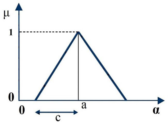 - The model is as follows:where is the fuzzy dependent variable; j = 1, …, m; i = 1, …, n; = (ai, ci) are symmetric fuzzy triangular numbers selected as coefficients; and x is the independent variable (Figure 1). In addition, n is the number of independent variables; m is the number of data; a is the central value (where μ = 1); and c is the semi-width.